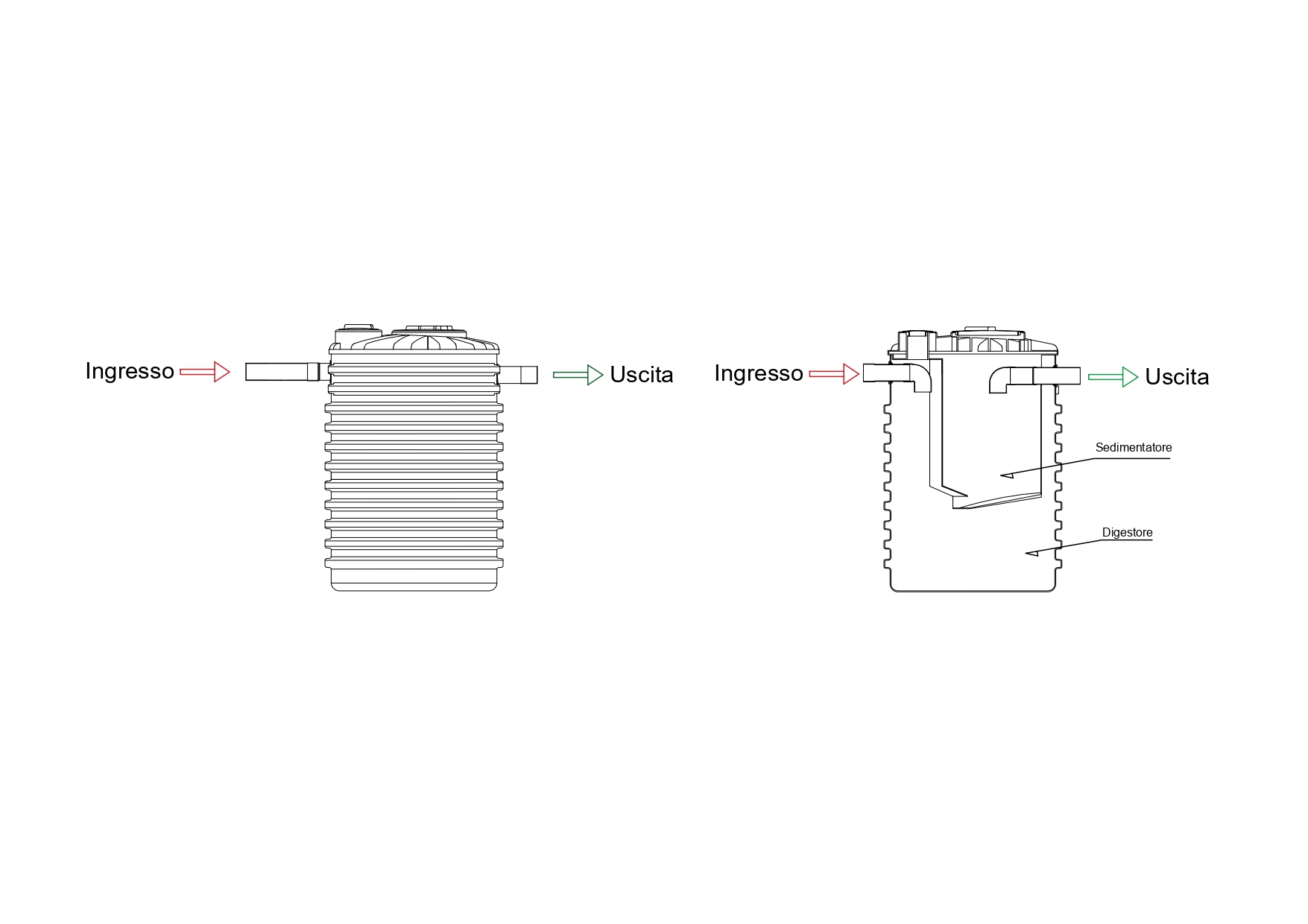 • Sedimentazione Primaria: Le acque reflue entrano nella prima camera, dove i solidi si separano per gravità e si depositano sul fondo.