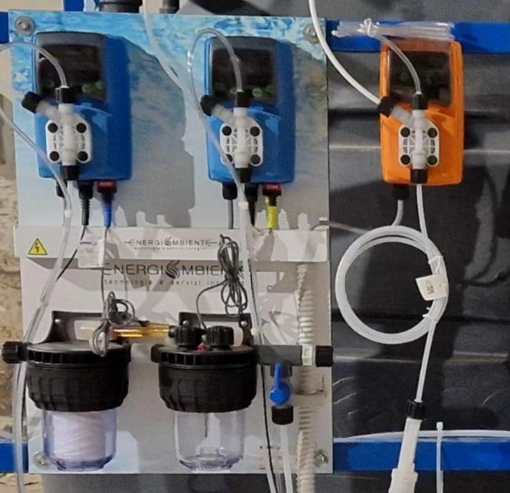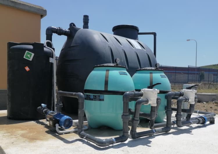 Il chiarificato passa a gravità ad un serbatoio di rilancio, per essere veicolato tramite pompa di sollevamento al trattamento terziario di filtrazione meccanica e successivo adsorbimento chimico su letto di quarzite e carboni attivi